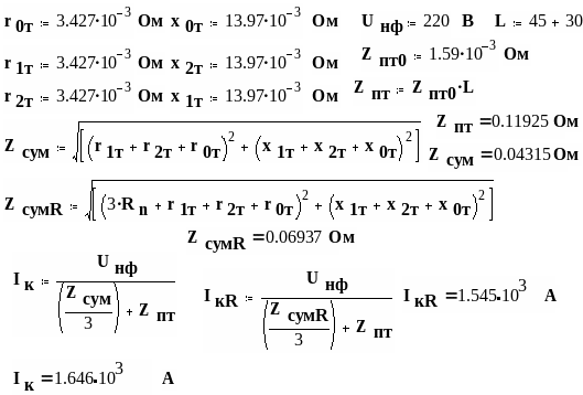-Сопротивление элементов сети (трансформатора, кабелей) рекомендуется принять по [1] или [2], в случае невозможности нахождения величины Zпт для кабелей, можно принимать: Zпто=2,3*Zо(1) (т.е. принимать величину удельного полного сопротивления петли фаза-нуль в 2,3 раза больше активного удельного сопротивления жилы);