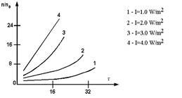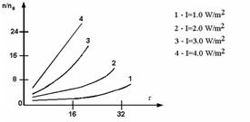 Во-вторых, в условиях стесненности частиц, сила Стокса увеличивается в области их повышенной концентрации, реализуется коллективное взаимодействие большого скопления частиц аэрозоля. Влияние этого механизма может стать более существенным, чем влияние механизма Бернулли. При высоких частотах нестабильность плотности обусловлена перепадом давления между областями с повышенными и пониженными концентрациями. При более низких частотах неустойчивость обусловлена как механизмом Бернулли, так и влиянием эффекта стесненности Стокса. Вторым, после частоты, действующим фактором коагуляции является интенсивность ультразвукового излучения Iп . На рисунке 1 представлены характерные зависимости степени осаждения n/n0 (где n – концентрация частиц за время облучения; n0 – концентрация частиц в начальный момент облучения) от времени облучения ультразвуком и его интенсивности для тумана хлористого аммония.