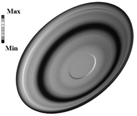 На рисунке 4 показано распределение амплитуд колебаний на пятой гармонике дискового излучателя. Частота излучения диска равна 20 кГц.