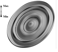 Как указывалось выше, осаждение частиц разных размеров происходит при разной частоте колебаний: чем меньше размеры коагулируемых частиц, тем выше требуемая частота. Дисковый излучатель может иметь первую гармонику в герцовом диапазоне, а, например, пятую гармонику на частоте около и более 20 кГц. Таким образом, дисковый излучатель может использоваться в широком диапазоне частот и оказывать эффективное воздействие на частицы разного размера. На рисунке 3 показано распределение амплитуд колебаний на первой гармонике дискового излучателя диаметром 340 мм. Резонансная частота излучателя равна 300 Гц.