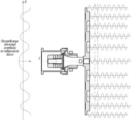 Интенсивность колебаний, создаваемых таким излучателем диаметром 340 мм на расстоянии 3–4 м, составляет 147-152 дБ [4]. Таким образом, излучатель с фазовыравнивающими элементами способен обеспечить наилучшие характеристики акустического поля по сравнению с излучателем с преимущественным излучением одной фазы. На рисунке 10 показана конструкция излучателя, включающего в себя полуволновую одноэлементную УЗКС с полуволновым концентратором и излучающий диск, с преимущественным излучением одной фазы колебаний.