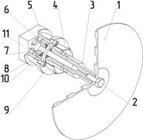 1 – излучающий диск; 2 – болт; 3 – дополнительный концентратор; 4 – основной концентратор; 5 – пьезоэлектрические элементы; 6 – задняя частотнопонижающая накладка; 7 – шпилька; 8 – кольцо акустической развязки; 9 – фланец корпуса; 10 – корпус; 11