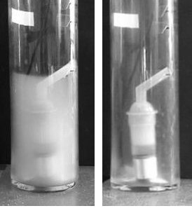 Для проверки эффективности разработанного фокусирующего дискового излучателя был проведен эксперимент по подавлению высококонцентрированного аэрозоля в замкнутом пространстве (колба диаметром 150 мм) в котором находился источник жидкостного аэрозоля (ультразвуковой медицинский ингалятор) с размером капель 1…5 мкм (капели этого размера наиболее легко приникает в альвеолы легких). Начальная концентрация аэрозоля составляла 10 мл/м3 . На рисунке 13 а и 13 б показаны фотографии, иллюстрирующие изменение концентрации аэрозоля до и после ультразвукового воздействия.