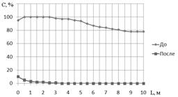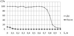 Первоначально в коробе формируется локальное облако аэрозоля (размер частиц 1..5 мкм) протяженностью (L) около 1 м и концентрацией (C ) 10 мл/м3 , равномерной вдоль всего облака (вентилятор отключен). После ультразвукового воздействия с расстояния 50 м в течение 10 сек. распределение концентрации аэрозоля приняло вид, показанный на рисунке 15 (в процентах от исходной концентрации). Таким образом, аэрозоль был полностью коагулирован (>99%).